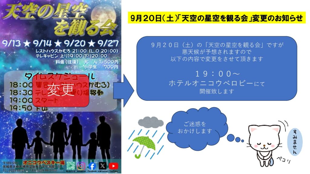 9月20日(土)「天空の星空を観る会」変更のお知らせ